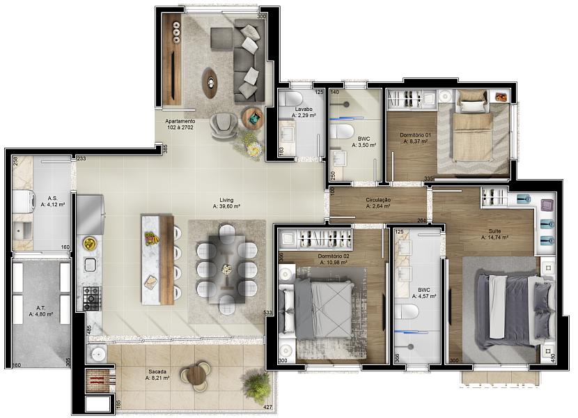 Apartamentos de 122m² com alto padrão de acabamento, prontos para você viver o melhor da vida.