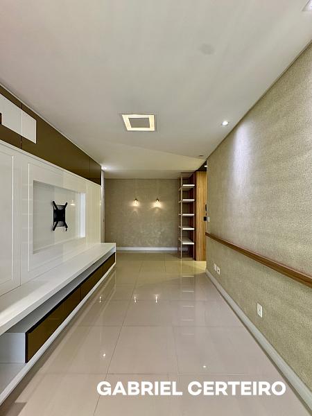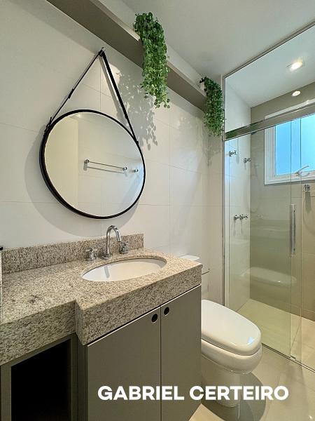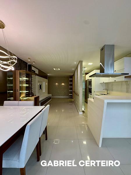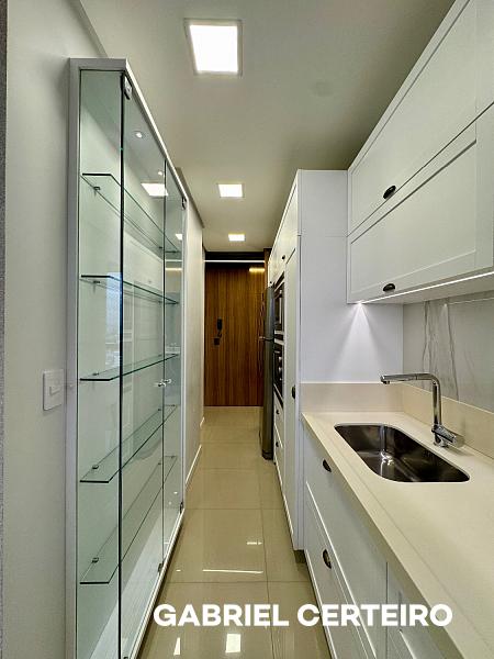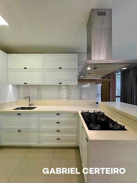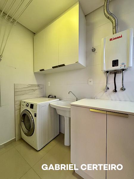 A cozinha é integrada com ilha, e a lavanderia é independente. O apartamento vem mobiliado e equipado, trazendo praticidade para quem busca algo pronto para usar no dia a dia.