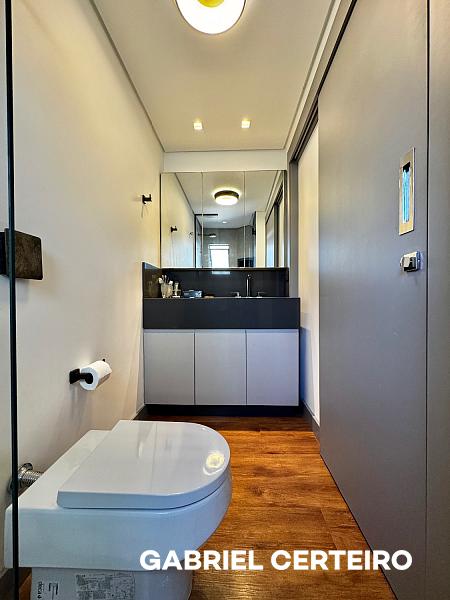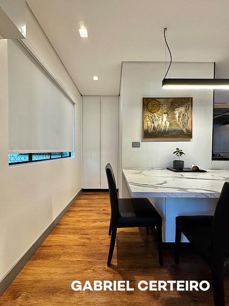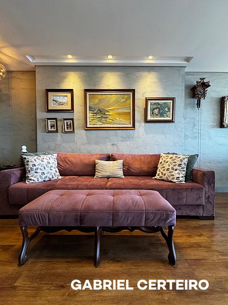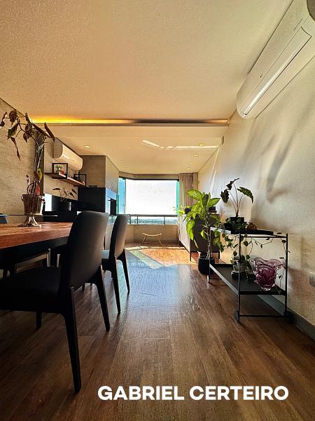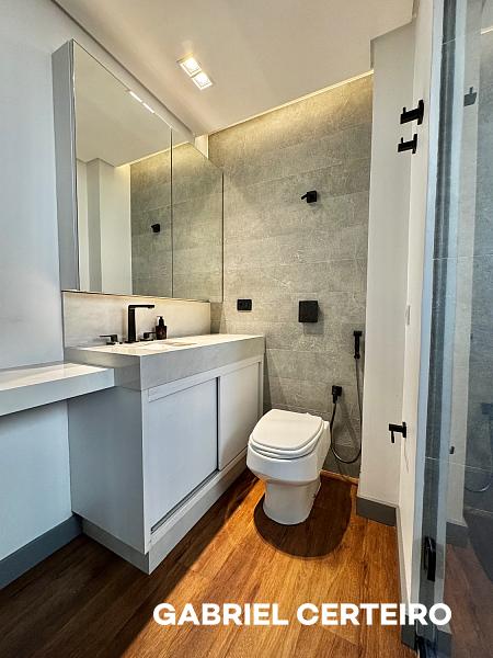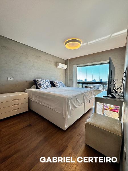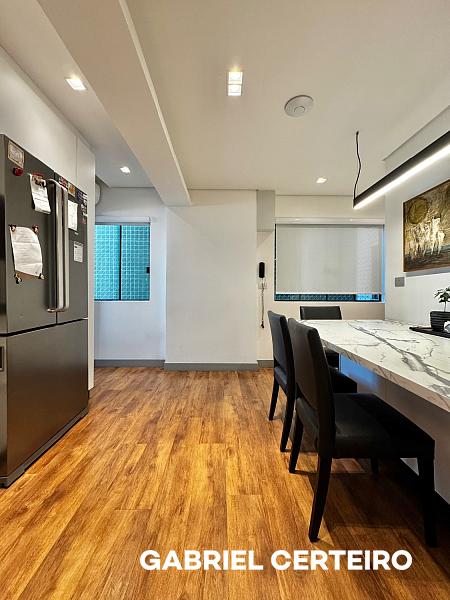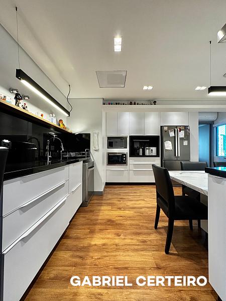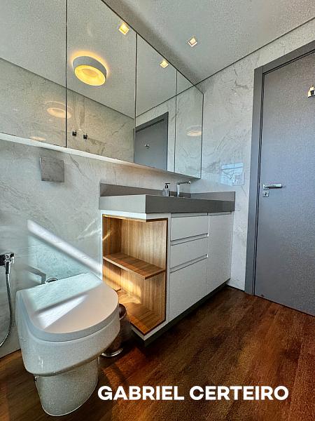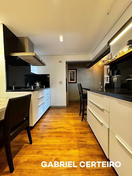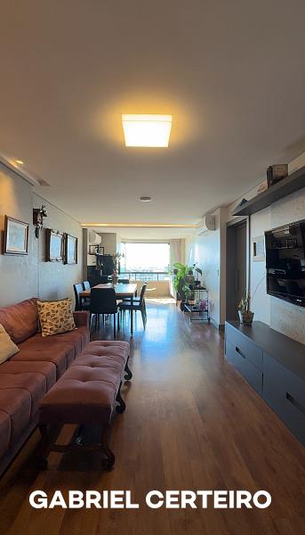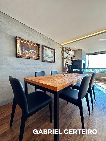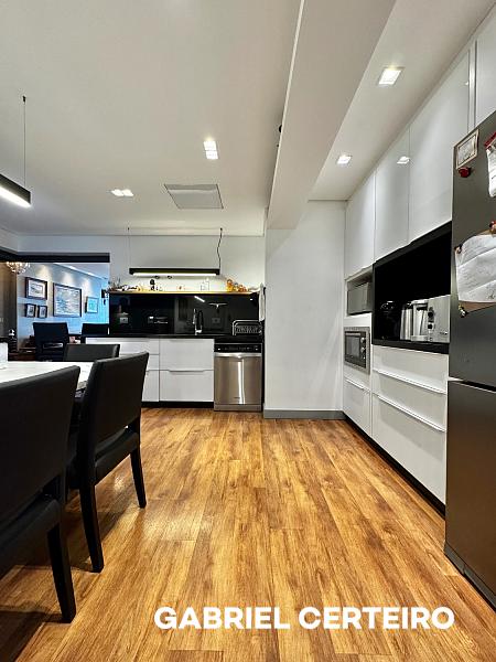 Este apartamento semi-mobiliado possui 3 suítes, sendo que a suíte principal conta com closet. A sala de estar e jantar são integradas, e há uma sacada com churrasqueira a carvão. A cozinha, a área de serviço e a despensa oferecem funcionalidades práticas. Um lavabo está presente na área social. O imóvel inclui 3 vagas de garagem.