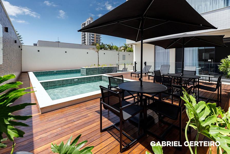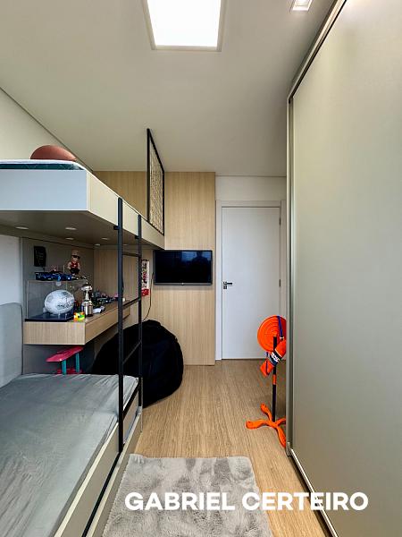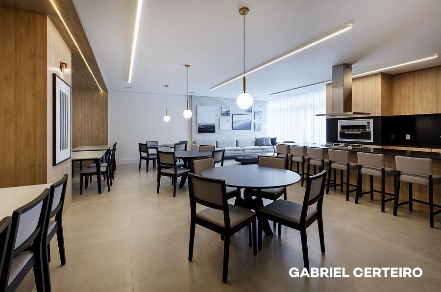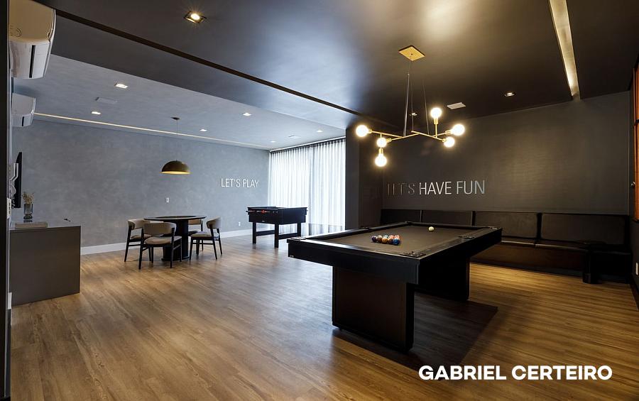 O condomínio oferece uma estrutura de lazer completa, distribuída em dois pavimentos, incluindo salão de festas, espaço kids, playground, sala de jogos, piscina, bar da piscina, academia, cinema e pub.