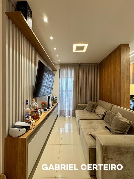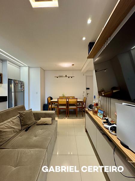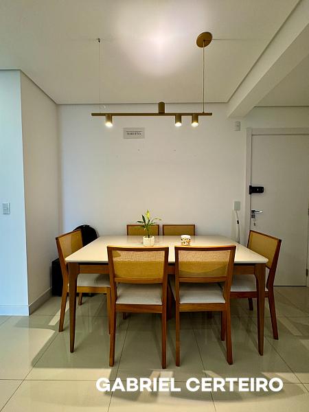 O apartamento possui 69,79 metros quadrados privativos, com uma suíte mais um dormitório, living integrado, banheiro social, sacada com churrasqueira a carvão e vista livre. Conta ainda com uma vaga de garagem. Já está mobiliado e equipado, pronto para uso imediato.