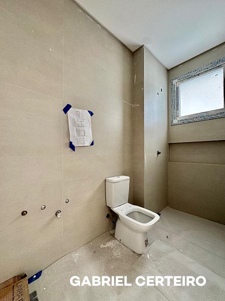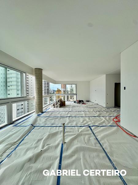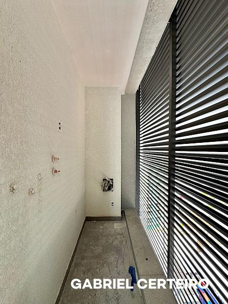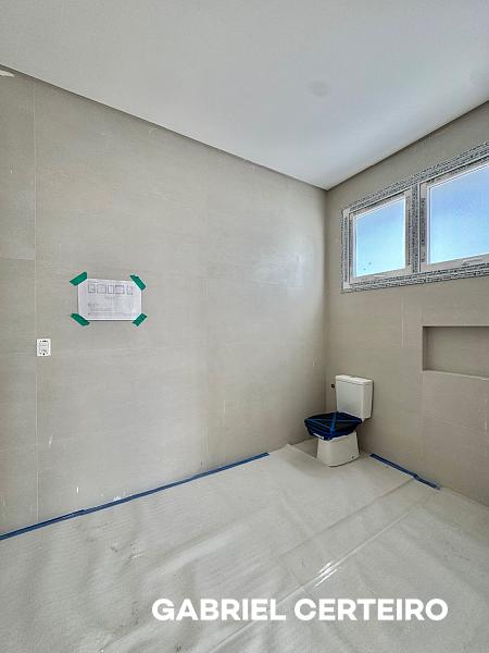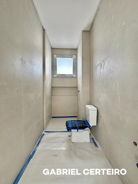 São 3 suítes, sendo uma máster com closet, além de lavabo. Os banheiros contam com aquecimento de piso, nichos embutidos e ponto para toalheiro aquecido. Piso vinílico na área íntima, porcelanato nas áreas sociais, portas laqueadas, rodapés brancos e manta acústica na laje.