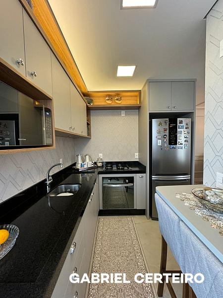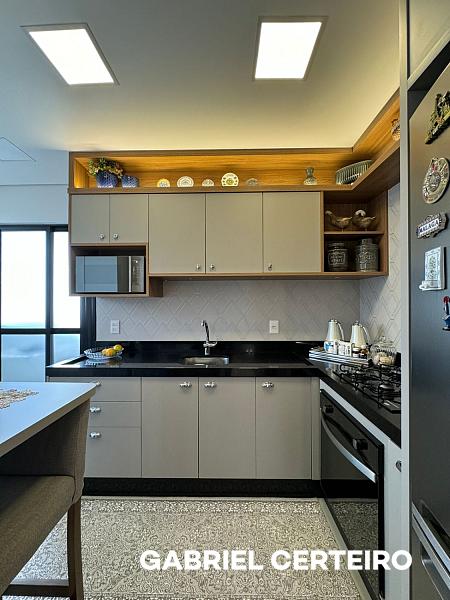 Este apartamento de 84m² privativos conta com 2 dormitórios, sala de estar, cozinha, banheiro social, área de serviço e 2 vagas de garagem.