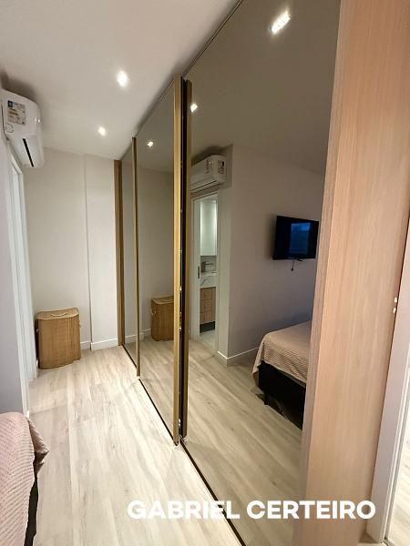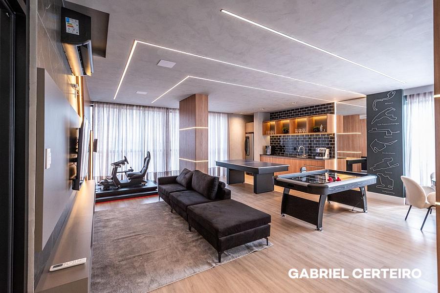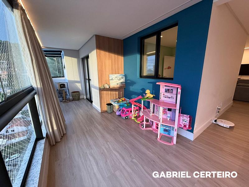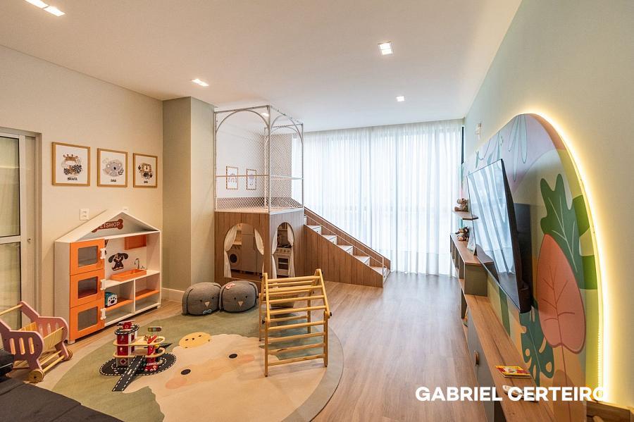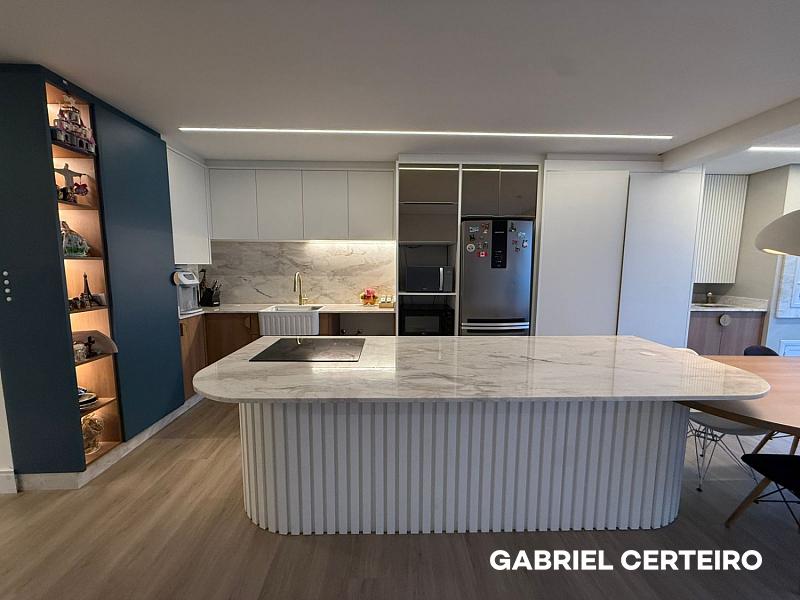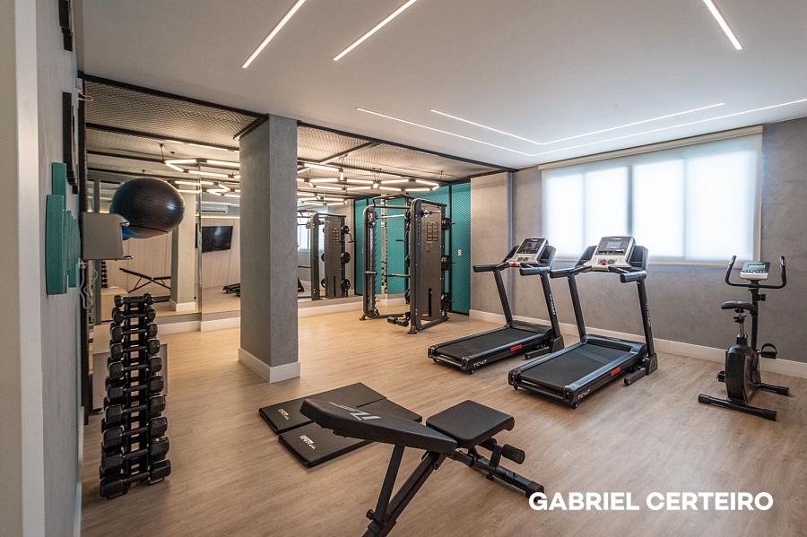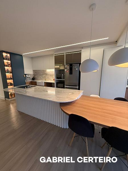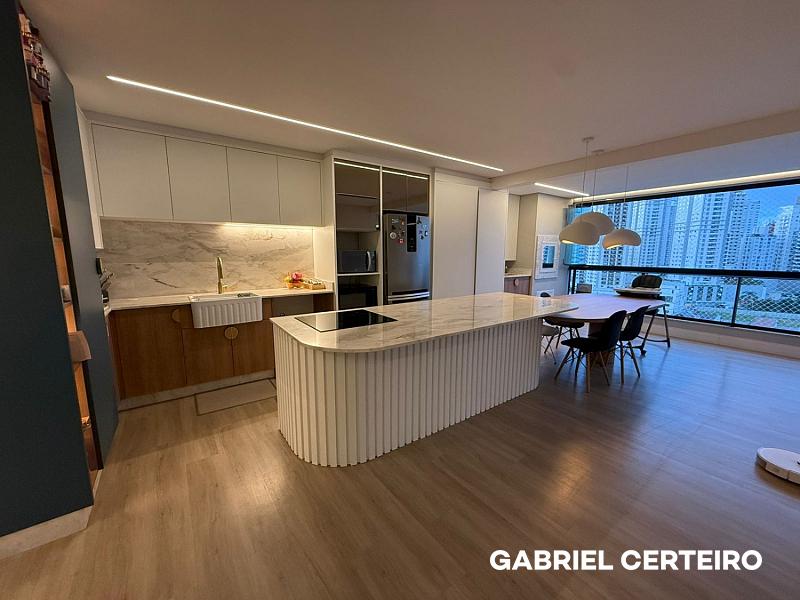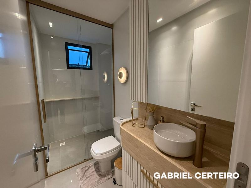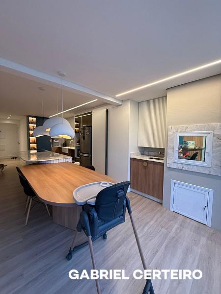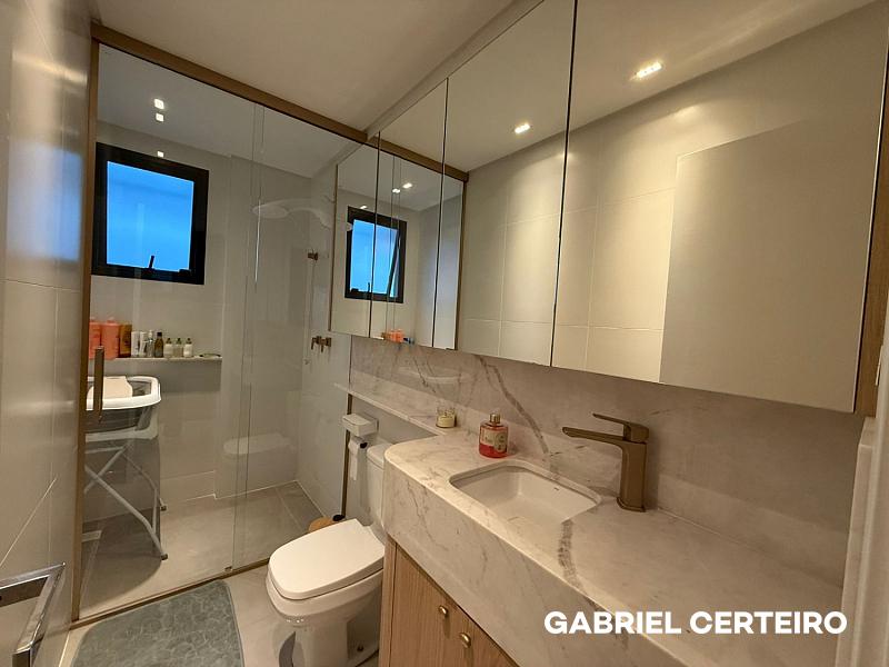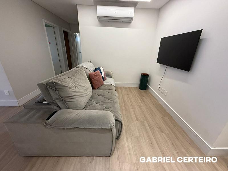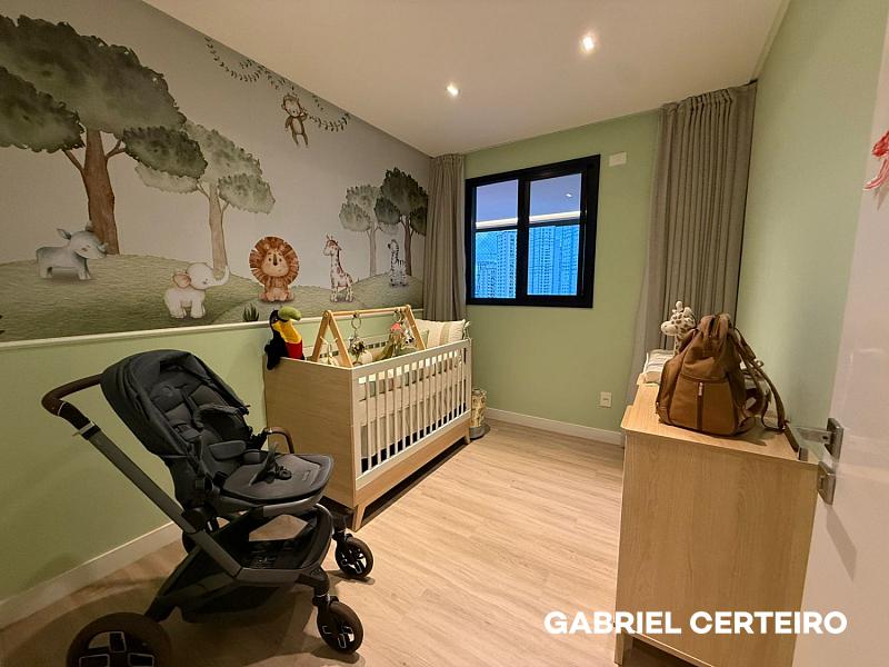 A unidade possui 110 m² de área privativa, 3 dormitórios sendo 1 suíte, 2 banheiros e 2 vagas de garagem. O apartamento é entregue com mobília sob medida na cozinha, banheiros e suíte, além de piso vinílico em todos os ambientes, acabamento em gesso, fechadura com senha na porta de entrada, infraestrutura para água quente, espera para split, hidrômetro e gás individuais e sacada. Um imóvel pronto para morar, com alto nível de acabamento e praticidade no dia a dia.