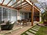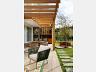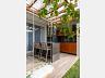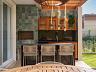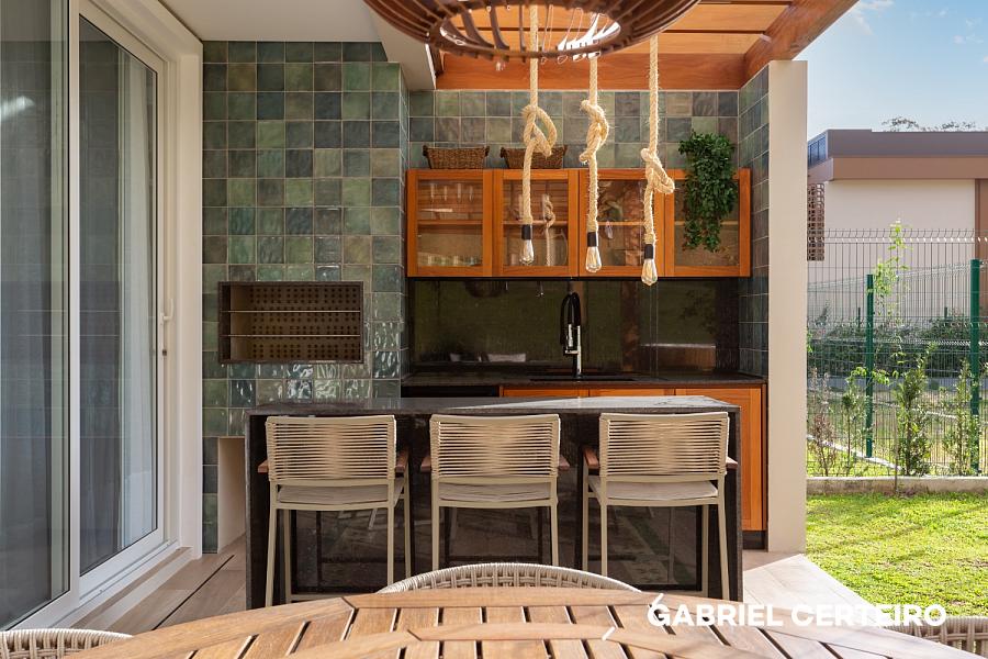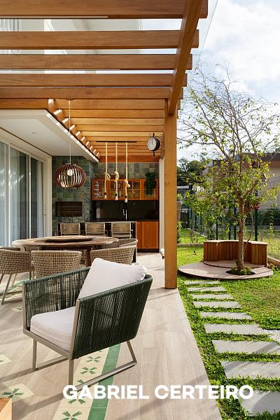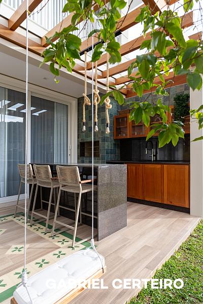 Nos fundos, a área de lazer privativa oferece um ambiente completo e acolhedor, com churrasqueira a carvão, jacuzzi para quatro pessoas, pergolado em vidro retrátil, chuveiro com água quente e fria, jardim com jaboticabeira e uma charmosa fonte decorativa.