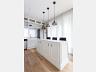 A área social impressiona pelo pé-direito duplo e integração entre sala de estar, sala de jantar e cozinha planejada em Corian, com bancada em L, ilha central e cuba americana — perfeita para quem gosta de cozinhar e receber.