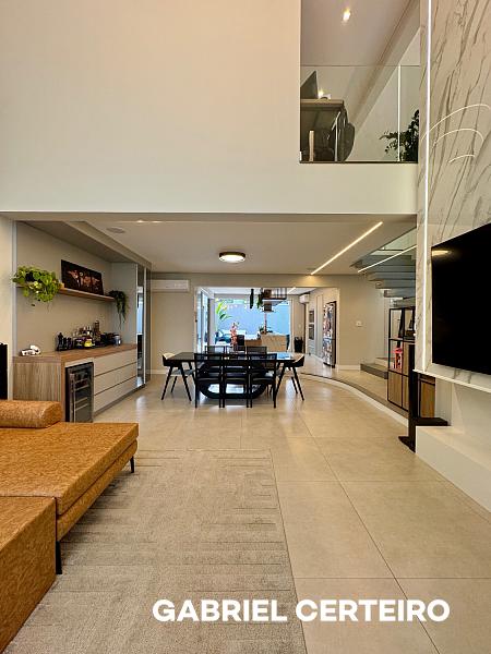 Os ambientes integrados valorizam a amplitude: living com pé-direito duplo, sala de estar, jantar, adega e cozinha em perfeita harmonia. A área de festas é um convite para momentos especiais, equipada com churrasqueira de espetos giratórios, cervejeira e piscina aquecida.